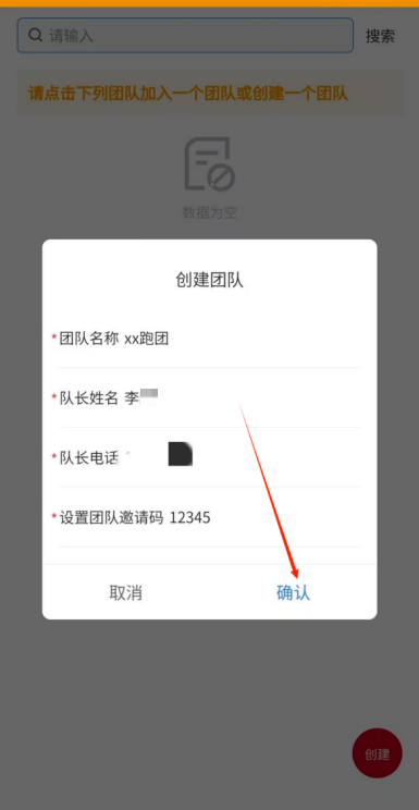 跳转页面之后,队长如果未创建团队,要先创建团队,点击右下方“创建”,输入要创建团队信息:团队名称、队长姓名、队长电话、设置团队邀请码(团队邀请码用于团报选手报名时验证要加入的团队,6位数,数字,字母均可),输入完成后点击“确认”。