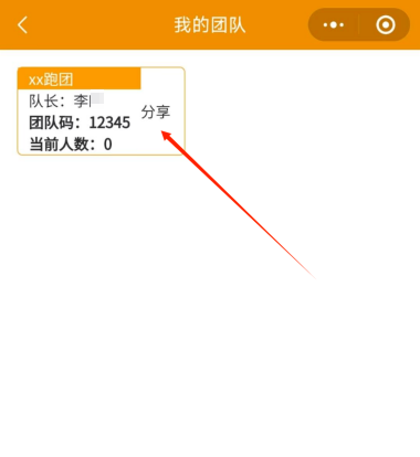 队长在首页点击“我的团队”,跳转页面后点击“分享”,生成跑团“专属邀请码”海报。